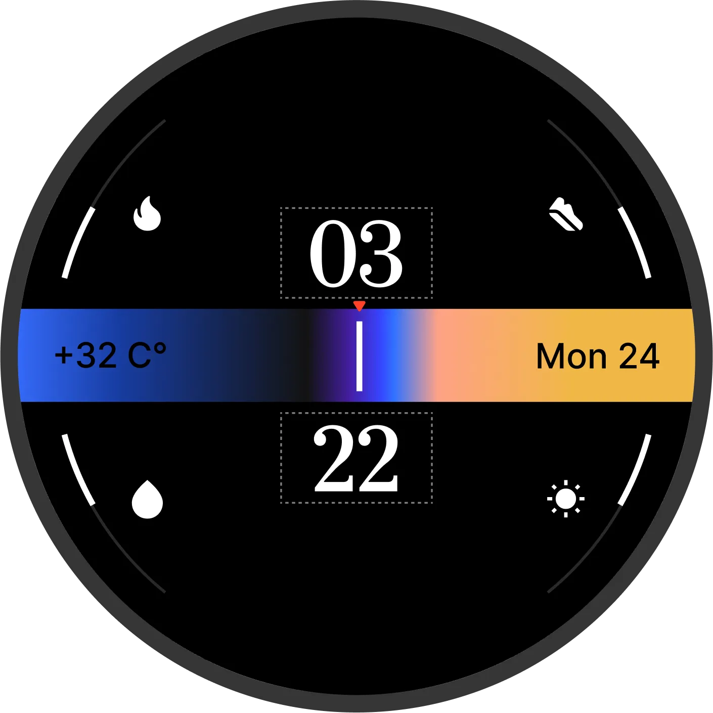 These particular faces visualize the passage of a daythrough gradients —capturing sunrises and sunsets as a continuous flow of time.